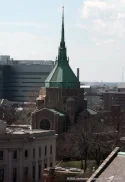 This church's stylized Gothic form makes it one of the most recognized landmarks of the University Circle area. Architect Bertram Goodhue also designed the Central Library in Los Angeles, the State Capitol building in Lincoln, Nebraska, and several of the structures in San Diego's Balboa Park. Goodhue passed away before this church's construction was complete and Cleveland-based Walker & Weeks oversaw the completion. The building is sometimes referred to as the "Holy Oil Can" in reference to the overall silhouette and steeple.